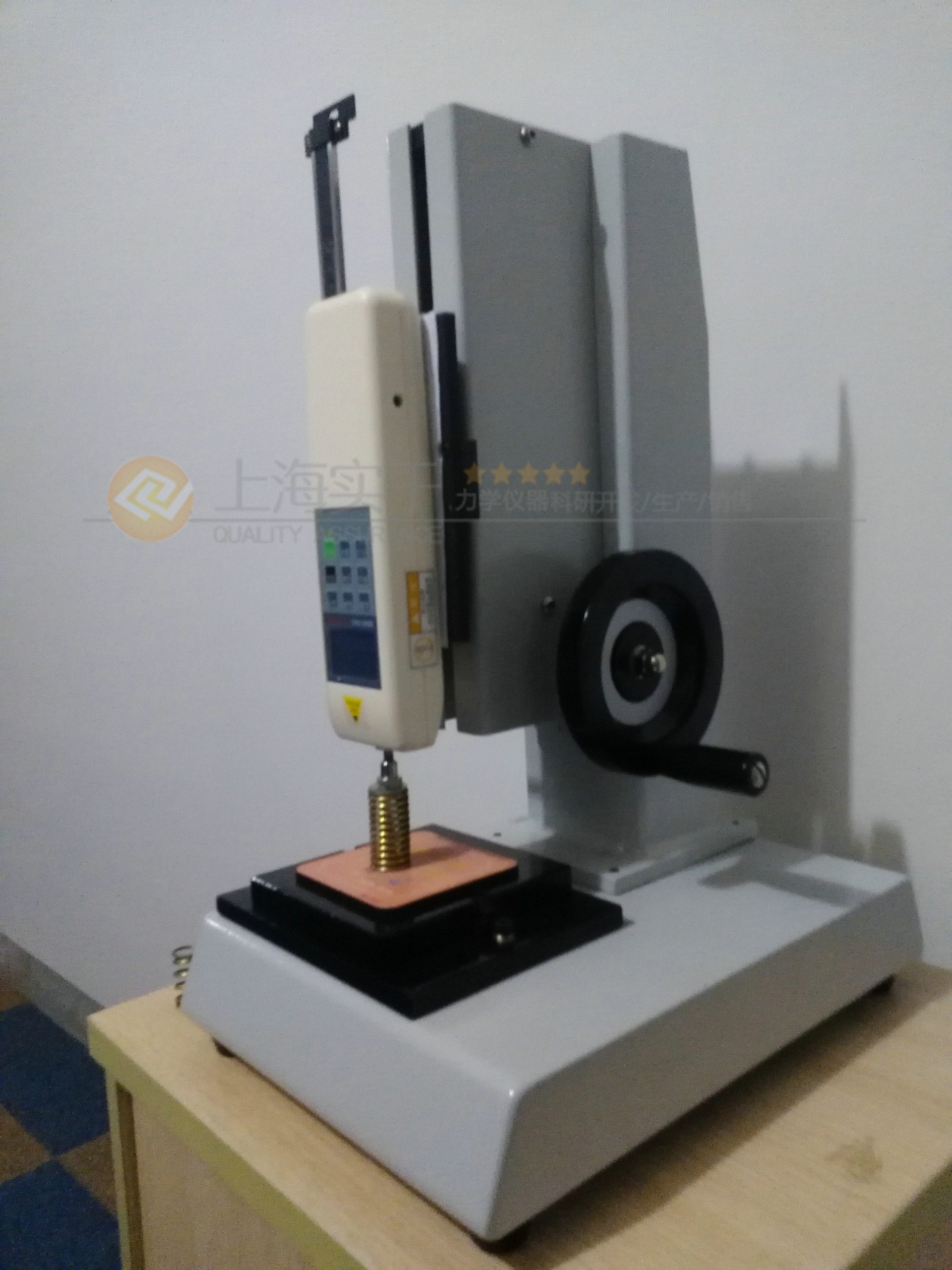 (4)安裝好推拉力計表后,用M4內六角扳手將測力計安裝板重新安裝到機架上面。根據所需測試的樣品特點,將其機臺安裝或安放在工作臺上合適的位置。旋轉測試架側面的手輪,測力計就能上下平穩移動,完成測試工作。 ?